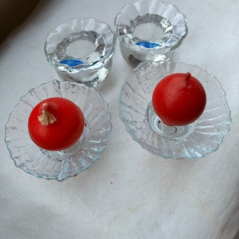 Nuutajärven virheettömät Kerttu Nurmisen 2 kääntökynttilänjalkaa joissa 5cl kynttilät uudesta kynttilämassasta. Sydänkoristeet kierrätettyä kynttilämassaa. Myydään parina.