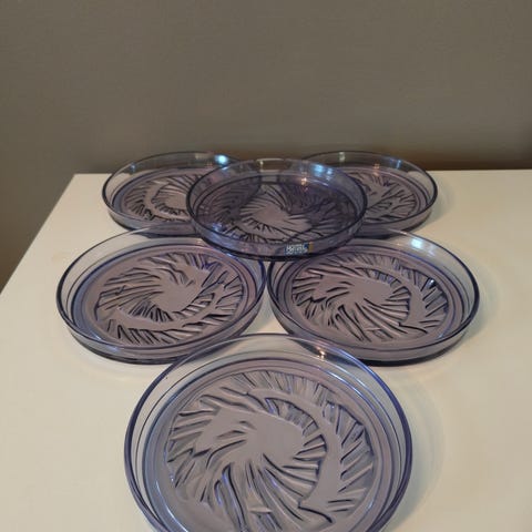 Myynnissä upea setti violetinsävyisiä lasikulhoja, joissa koristeellinen marja-/kuviopohja ja kaunis, paksu reunus.
