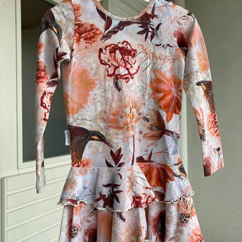 Gugguun kaunis bambimekko. Siistikuntoinen, vähän käytetty. Koko 104, mutta käytettävissä jo 98 koossa.