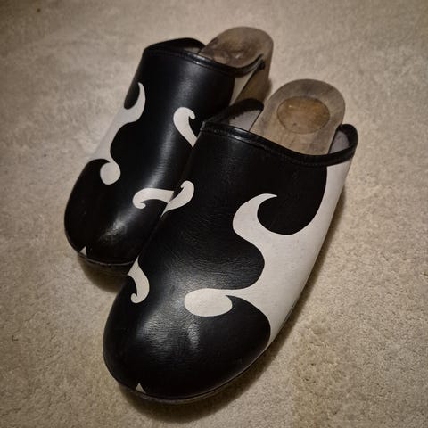 Marimekko Puukengät ja pistokkaat, koko 38, mustavalkoinen kukkakuosi. Kengät on valmistettu puusta ja nahasta, sopivat sekä sisä- että ulkokäyttöön. Kengissä on avonainen kantapää ja liukumaton kumipohja. Vähän käytetty.