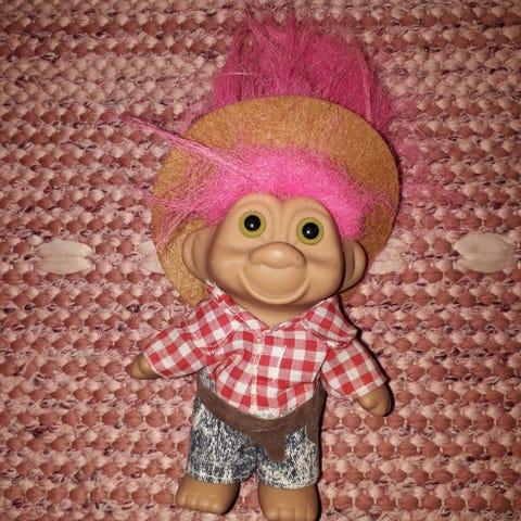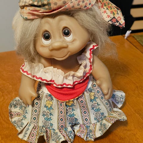 Kaksi trollinukkea, joista toinen pukeutunut valkoiseen kokin hattuun ja punavalkoiseen ruutukuosiin, toinen siniseen mekkoon. Nukkeparin koko on keskikokoinen, materiaalina pehmeä muovi ja kangasvaatteet. Sopii keräilyyn tai koristeeksi. Tarjouksia vastaanotetaan, suurin tarjous saa nämä omakseen.