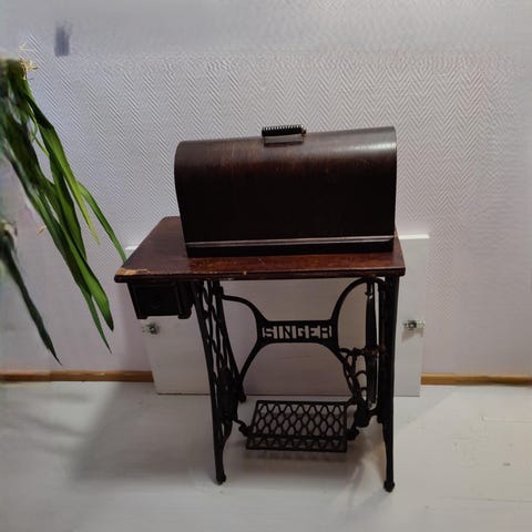 Kaunis, melkein satavuotias antiikkinen ompelukone, joka toimii myös tyylikkäänä sivupöytänä tai työpöytänä. Ompelukone toimii polkimella.