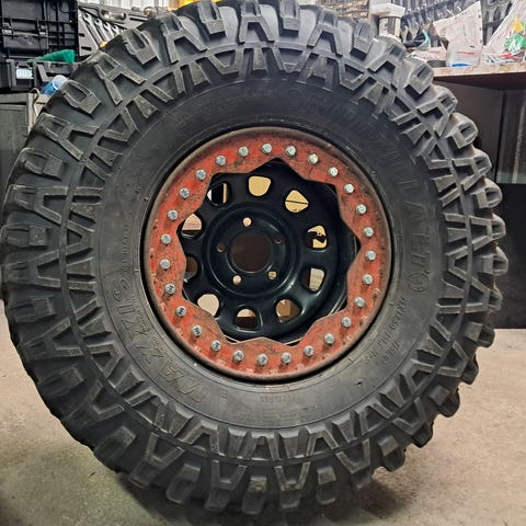 Tästä hyväkuntoiset isohkot maasturin renkaat. Näillä ei ole montaa tuhatta kilometriä ajettua ja pintaa reilu 12mm keskellä. Tasaisesti kuluneet. 285/75R16 koossa, joka korkeudeltaan lähellä 33". Eivät mahtuneet pyörimään omassa autossa niin pienemmät hommattu tilalle. Tarvittaessa löytyy peltivanteet 6x139,7 jaolla, kuvan alumiinivanteet jää omaan käyttöön.