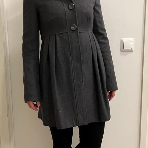 Todella siisti, ajaton, laadukas ja käyttökelpoinen villakangastakki. Päällysmateriaali 25% villaa. Koko XS / 34, mutta saattaa sopia myös S-kokoiselle. Materiaalit: polyesteri, villa, akryyli. Kankaassa on joissain kohdin käytöstä johtuvaa ihan pientä nukkaisuutta (näitä voi saksia vaikka kynsisaksilla pois, jos häiritsee) ja takin sisäosan ripustuslenkin alueella oleva keinonahka on kulunut (katso kuvat). Taloudessa ei ole eikä ole ollut lemmikkejä.