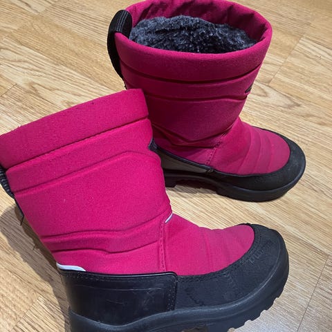 Kuoma lasten talvikengät, koko 27. Kengissä on painauma sisäpohjallisessa isovarpaiden kohdalla ja ne ovat olleet useammalla lapsella käytössä.