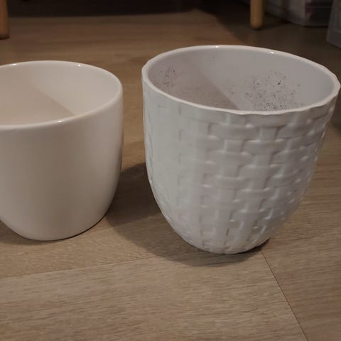 Punaiset suojaruukut joulukukille. Väri tummempi kuin kuvissa. Vasemmalla metalli ja muoviruukku, oikealla kaksi keraamista ruukkua.