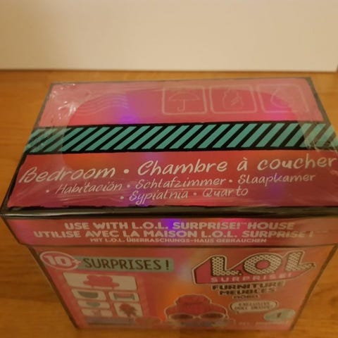 L.O.L. Surprise makuuhuoneen huonekalusetti sisältää mm nuken, vaaleanpunaisen sängyn, peilipöydän, pienen kaapin lukolla, harjan, pulloja ja muita pieniä tarvikkeita.