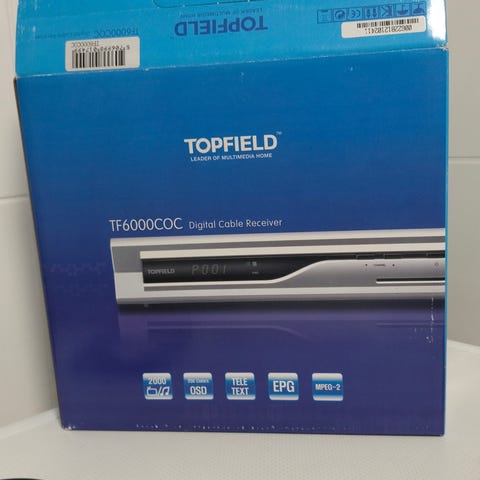 Hyvässä kunnossa Topfield TF520PVRt, tallennustila 500gb. Kaukosäätimen paristokansi kiinni teipin palalla, kun lukitus rikki, mutta toimii siitä huolimatta tosi hyvin eli napit ottavat hyvin kosketuksen, toimii. Hiljainen boksi. Vanha antenniverkon boksi, joka ei ilmeisesti HD-siirtymän vuoksi näytä Suomen kanavia. Kokeillaan myyntiä vain, jos joku tarvitsee jotain varaosiksi tai korttipaikkaa tai kovalevyä tai muita osia johonkin omaan fiksailuun.