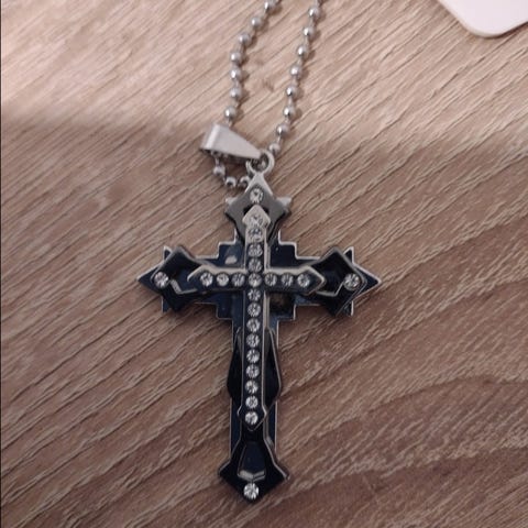 5 liki samanlaista + 1 pienempi ristiriipus, metallia, hopeanvärisellä ketjulla. Riipuksen pinta on kauniisti kuvioitu ja ketju on keskikokoinen. Ristin korkeus n 7,5 cm, ketjun mitta noin 60 cm.