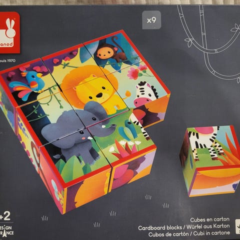 Janod merkkinen palapeli kuviopalikoista. Kuusi eri kuvaa. Laatikko hajonnut. Kunto palapelillä vielä ok, pientä naarmua lähitarkastelussa.