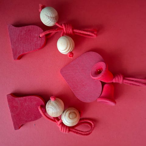 Vanhempaa tuotantoa oleva Aarikan joulukoriste, jossa puunvärisiä joulukelloja, kulkusia ja pieniä punaisia sydämiä.