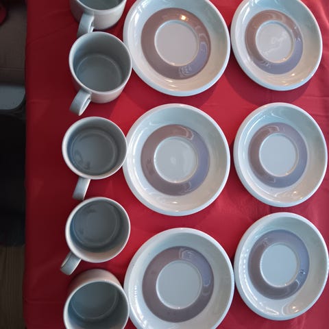 Myydään 6 kappaletta Arabian Tupa-sarjan kahvikuppia ja aluslautasta (6kpl kahvikuppia, 6kpl aluslautasta). Nämä Anja Jaatinen-Winquistin 1968 suunnittelemat astiat ovat sekä käytännöllisiä että yksinkertaisen muodikkaita. Myyn tuotteet settinä.