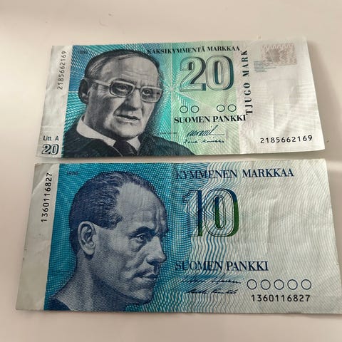 Suomen Pankki 2 x 20 Markkaa seteli, painovuosi 1993 ei Liit ja Liit.A. Setelin etupuolella on kuva suomalaisesta henkilöstä ja taustalla erilaisia graafisia elementtejä. Takapuolella on kuva arkkitehtonisesta rakennuksesta. Setelin värit ovat pääosin vihreän ja sinisen sävyisiä. Setelit ovat pakkasileitä hinta yht. 8 e posti 2.50 e