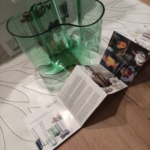 Iittala Aalto maljakko on valmistettu vihreästä lasista. Maljakolla on aaltoileva, orgaaninen muotoilu, joka on tyypillinen Aalto-sarjalle. Sopii koriste-esineeksi . Nouto vain Kaarinan Koristosta