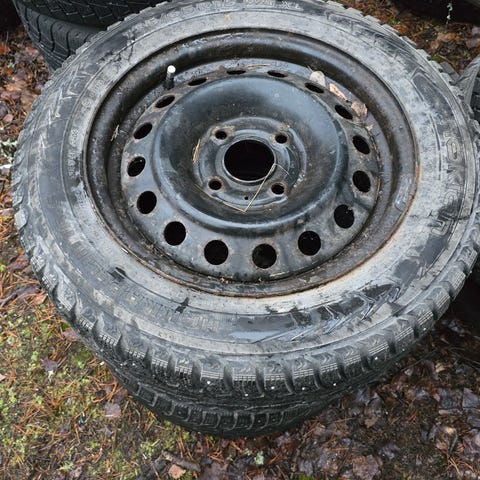 Vanhat nypityt nastat 5x114,3 jakoisilla pellivanteilla. Muistaakseni Nissanista. Kulutuspintaa n.3mm, justiinsa voisi kesän ajella. Kumien DOT1208.