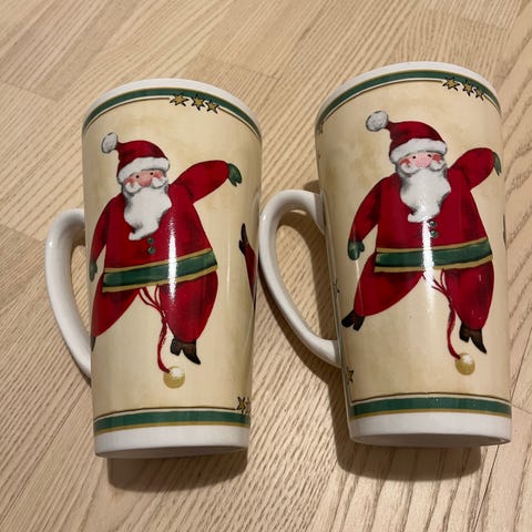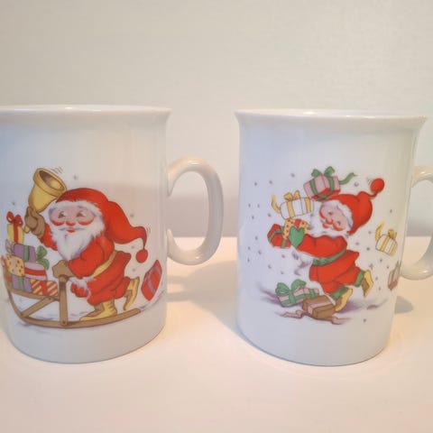 Dunoon jouluteemaiset 2kpl kahvimuki, jossa on kuvitus joulupukista jakamassa lahjoja.