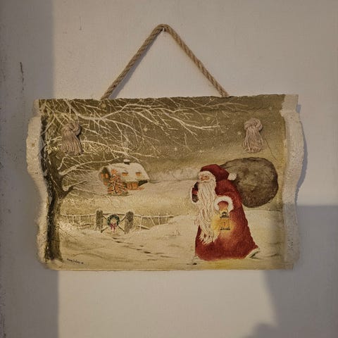 Taulu onnellisesta Joulupukista tuomassa onnea kotiin