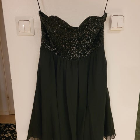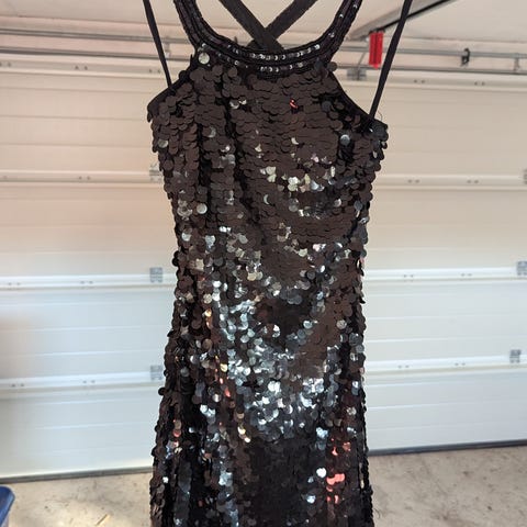 Bi @ Fang juhla- tai cocktailmekko, koko M. Mekko on musta ja valmistettu paljettimateriaalista. Siinä on pitkät hihat ja koristeelliset paljetit hihojen ja helman kohdalla. Mekko sopii erityistilaisuuksiin.ainoat pienet langan nousut virheenä joita ei kovin hyvin huomaa