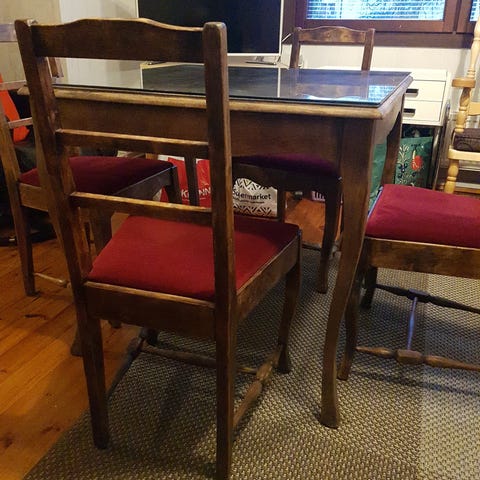Vanha pöytälevy, lasi päällä ja pukkijalat. Koko 80 x 180 cm.