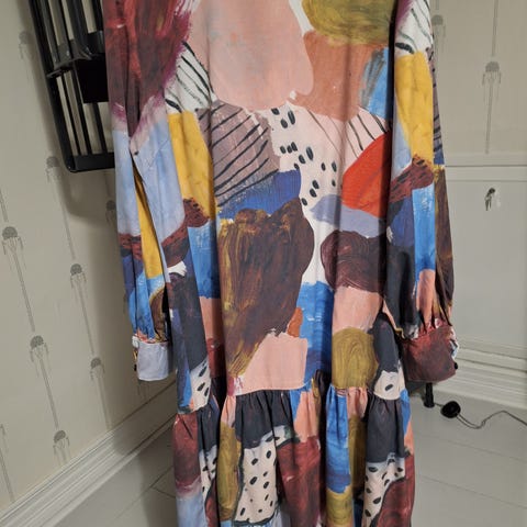 Erittäin hyväkuntoinen, lähes uudenveroinen mekko. Kainalo-kainalo 55 cm, olka-helma 125 cm. Midimittainen. 100 % kasvikuitu lyosell, ei muovia! Hengittävä, miellyttävän tuntuinen. Vyötöröllä nauha, hihansuissa napit. Taskut. Suunniteltu Suomessa, valmistettu Liettuassa. Hp. 95 €