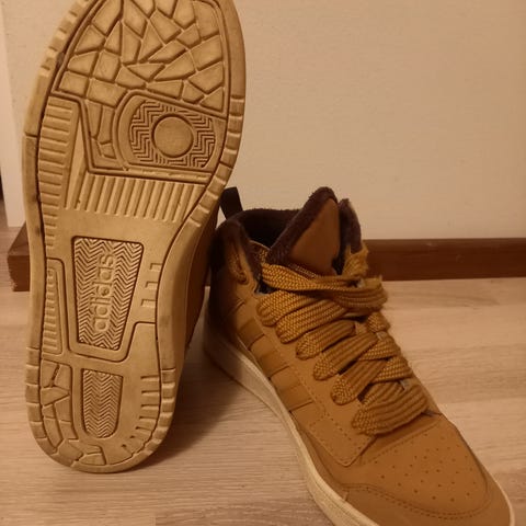Adidas kengät,vasta ostettu käytettynä,oli meillä harmiksi liian suuret. Molemmista kengistä toisen nauhan pää hieman kulunut, muuten kengät on erittäin hyväkuntoiset.