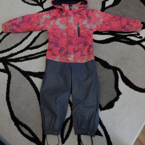 Kuivana pitävä haalari, meni meillä hyvin näillä nollakeleillä välihaalarin kanssa. Kaikki pinttymätahrat ei oo lähtenyt pesussa. Tullut meille käytettynä.