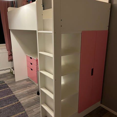 Sänkyyn kuuluu tikkaat ja kaiteet yläpetiin.