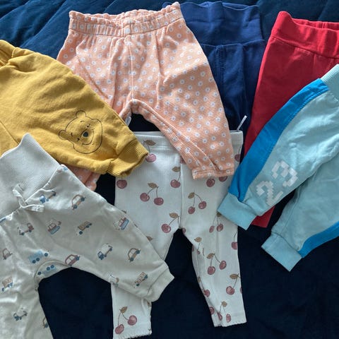 Paketti vauvan housuja, 13kpl, koossa 56-62. Lisäksi parit sukat ja töppöset. Kysy lisää yksittäisistä vaatteista.
