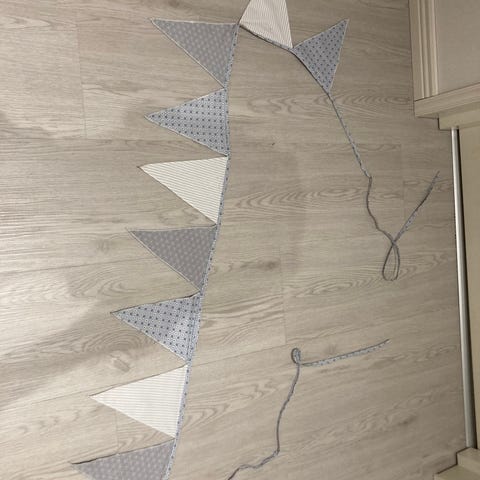 Valkoinen viirinauha. Pituus 4m. Korkea 20cm. Käsityö 100 % puuvillaa.