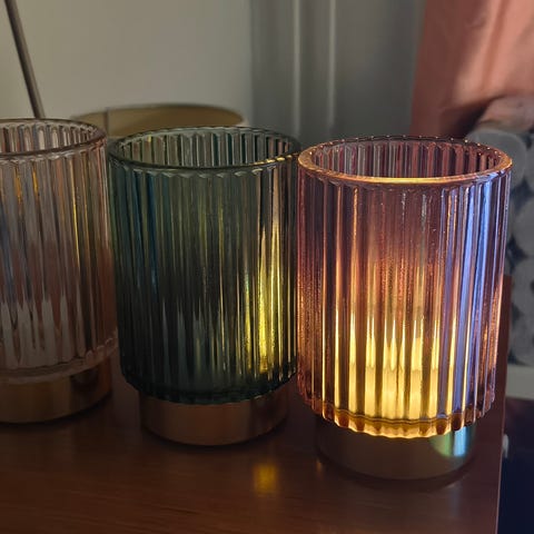Paristoilla ja ajastimella toimiva kynttelikkö. Valkoinen metalli. Korkeus 63 cm, leveys 39 cm.
