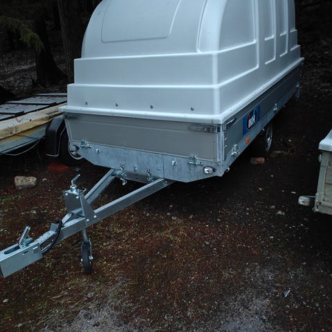 Te-Ho 311 peräkärry, varustettu harmaalla kuomulla. Yksi akseli, mitat noin 130 cm leveä ja 300cm pitkä. Sähköt juuri uusittu/korjattu.