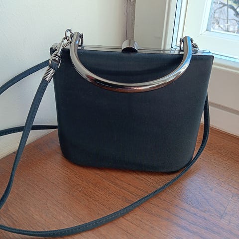 Musta iltalaukku, toimivalla ja jämäkällä kiinnityksellä. Lukko-osa kaunis yksityiskohta.