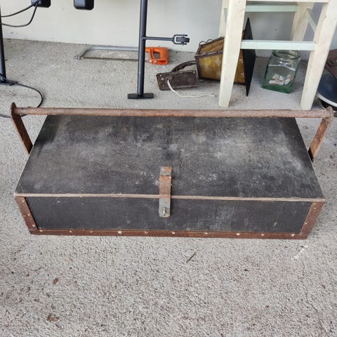 - kelt. laatikosto tarvikkeineen, kunto kohtalainen lev 30, kork 14, syv 16 cm