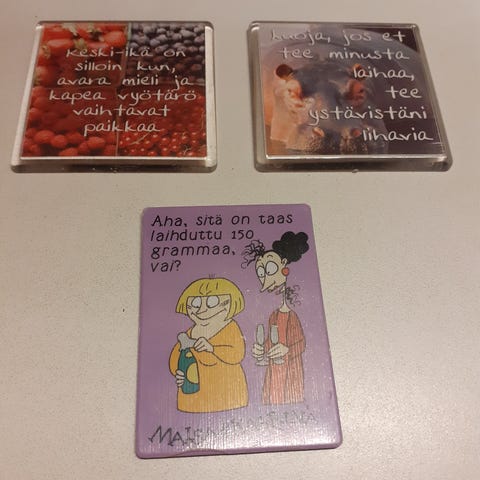 Kolme hauskaa naisfiguuri-magneettia. Itse tehty ilmakuivavasta savesta. Päällä lakka. Kivat vaikka lahjaksi 🥰! Uudet!