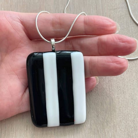 Sydänmuotoinen lasiriipus, jossa on violetti ja musta väriyhdistelmä. Riipus on kiinnitetty ohuelle metalliselle vaijerille.