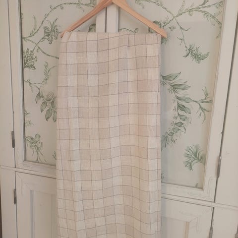 Kermanväriset laadukkaasta kankaasta verhot. 4 kpl ilmoitettua leveyttä. Yksi kpl leveämpi 142 cm. Yht 5 verhoa.