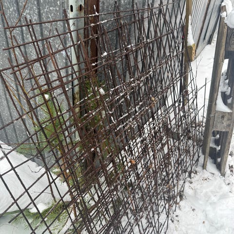 Etsinnässä noin 130*240 pala raudoitusverkkoa, jossa ”silmänkoko” 15 cm. Tulee köynösverkoksi, niin raudan paksuus ei olennainen.