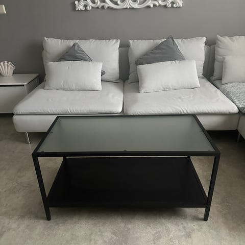 Pöytä, jossa musta lasikansi ja puujalat.Sopii olohuoneeseen tai muuhun tilaan, jossa tarvitaan tukevaa ja tyylikästä tasoa.