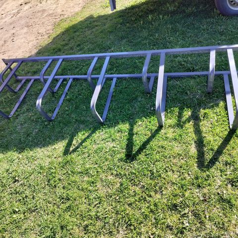 Metallipajalla teetetty pyöräteline, jossa mahdollisuus säätää tankojen välien leveyttä. Pituus 250 cm, tangon syvyys 88 cm.