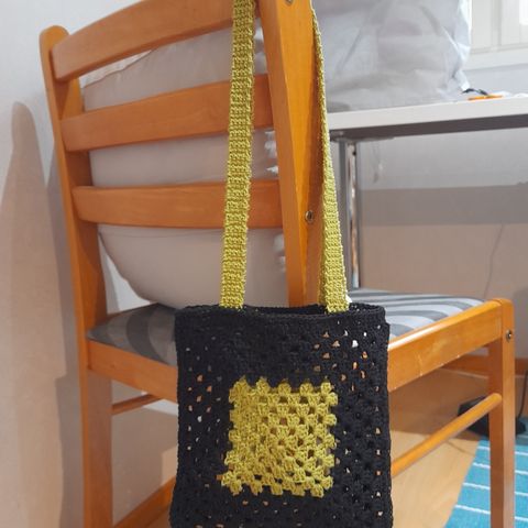 Musta, virkattu olkalaukku. Siisti ja hajuton laukku. Sisällä vetoketjutasku. Lev. 30 cm. pit. 33cm ja leveys 14cm. Lähetys sovittaessa.