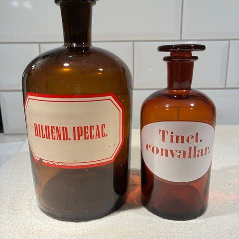 Kaksi apteekkipulloa, joissa on etiketeissä nimet Analginum ja Barbamylum. Pullot ovat valmistettu lasista, toinen ruskeaa ja toinen kirkasta lasia. Korkeudet noin 14cm ja 11cm. Mieluummin molemmat yhdessä. Pakkaan hyvin. Saa tarjotakkin.