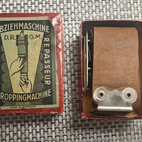 Allegro merkkinen partaterien teroituslaite. Toimiva, mutta soveltuu paremmin vanhoille hiiliterästerille. Valmistettu Sveitsissä.