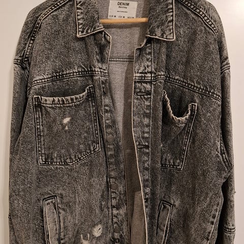 Bershka Denim talvitakki sinisessä värissä, koko L. Takki on valmistettu denimmateriaalista. Takissa on huppu, vetoketju ja napit edessä sekä säädettävä vyötärönyöri. Soveltuu ulkokäyttöön kylmemmillä säillä. Yhdestä taskun napista ja alimmasta napista lähtenyt päällinen pois. Muuten kunto todella hyvä. Mielestäni mitoitus on ehkä hieman keskimääräistä isompi, ainakin hihoissa on hyvin pituutta.
