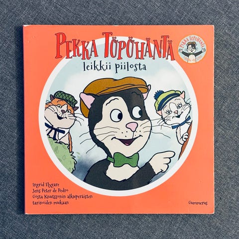 Kovakantinen kirja sarjassa Pekka Töpöhännän seikkailuita. Isoja piirrettyjä kuvia, tekstiä vähemmän.