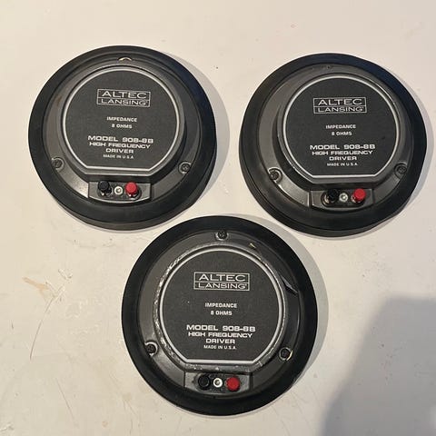 Eli Altec Lansingin valmistamat alumiiniset 811B torvet sekä niihin hyvin sopivat 908 compression driverit, 8 ohmisina.