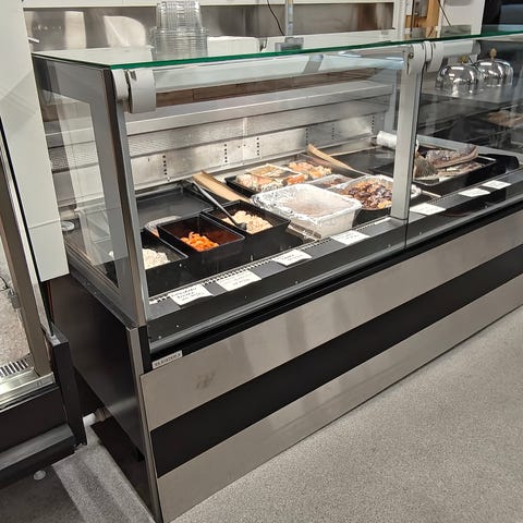 Lasinen tarjoilutiski ledvaloilla missä voidaan pitää kaikkea myytävää tuotetta