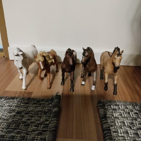 Schleich hevosaiheiset lelusetit sisältävät useita hevosfiguureja eri väreissä ja kokoja. Mukana on myös hevoskarsina ja erilaisia tarvikkeita. Lelut on valmistettu kestävästä materiaalista ja soveltuvat lasten leikkeihin.