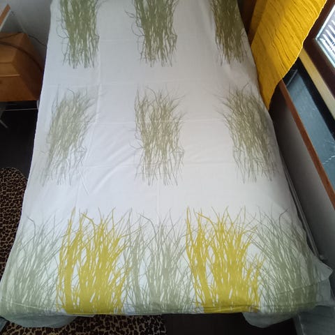 Paksua vahvaa puuvillaa, päädyt ommeltu. Ostettu second handista ja odottanut 10 vuotta kaapissa sopivaa käyttöä, löytyisikö sinulta?