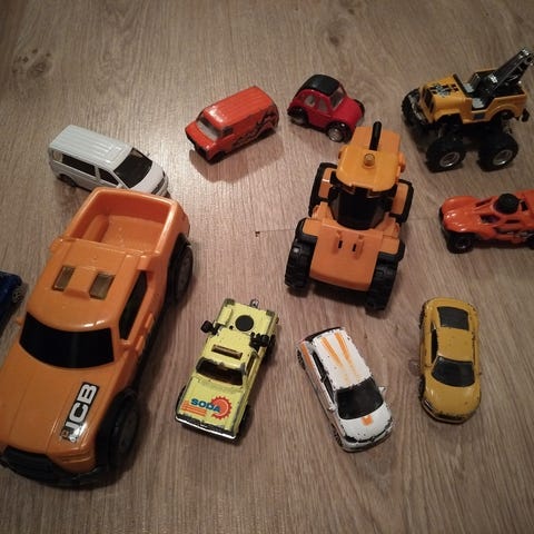 Lapsen leikeistä jääneet ajoneuvot; kaivuri, trukki, bensa kuljetus säiliöauto ja kolme pikkuautoa, joista isoimmasdavauhtipyörp. Osa meille uusina ostettuja, osa käytettyinä.