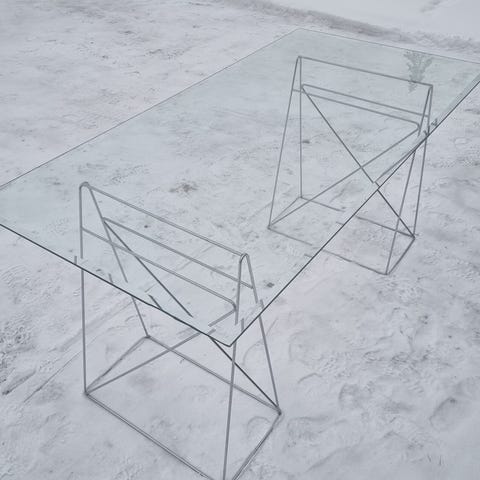 Myydään muuton tieltä kaunis, vähän harvinaisempi lasikantinen pöytä valkoisilla metallijaloilla (alumiini?) sekä kaksi tuolia. Kunnoksi laitoin kohtalainen, sillä läheltä katsottuna lasipinnassa jo paljon naarmuja. Eivät kuitenkaan helposti erotu ja yleisilme onkin siisti. Tuolit 2kpl Ikean SANDSBERG-mallia, (11,50e). Kauppaan kuuluu myös Ikealta hankitut VIPPÄRT tuolinpehmusteet, (ovh. 7,99e) jotka kuvassa.